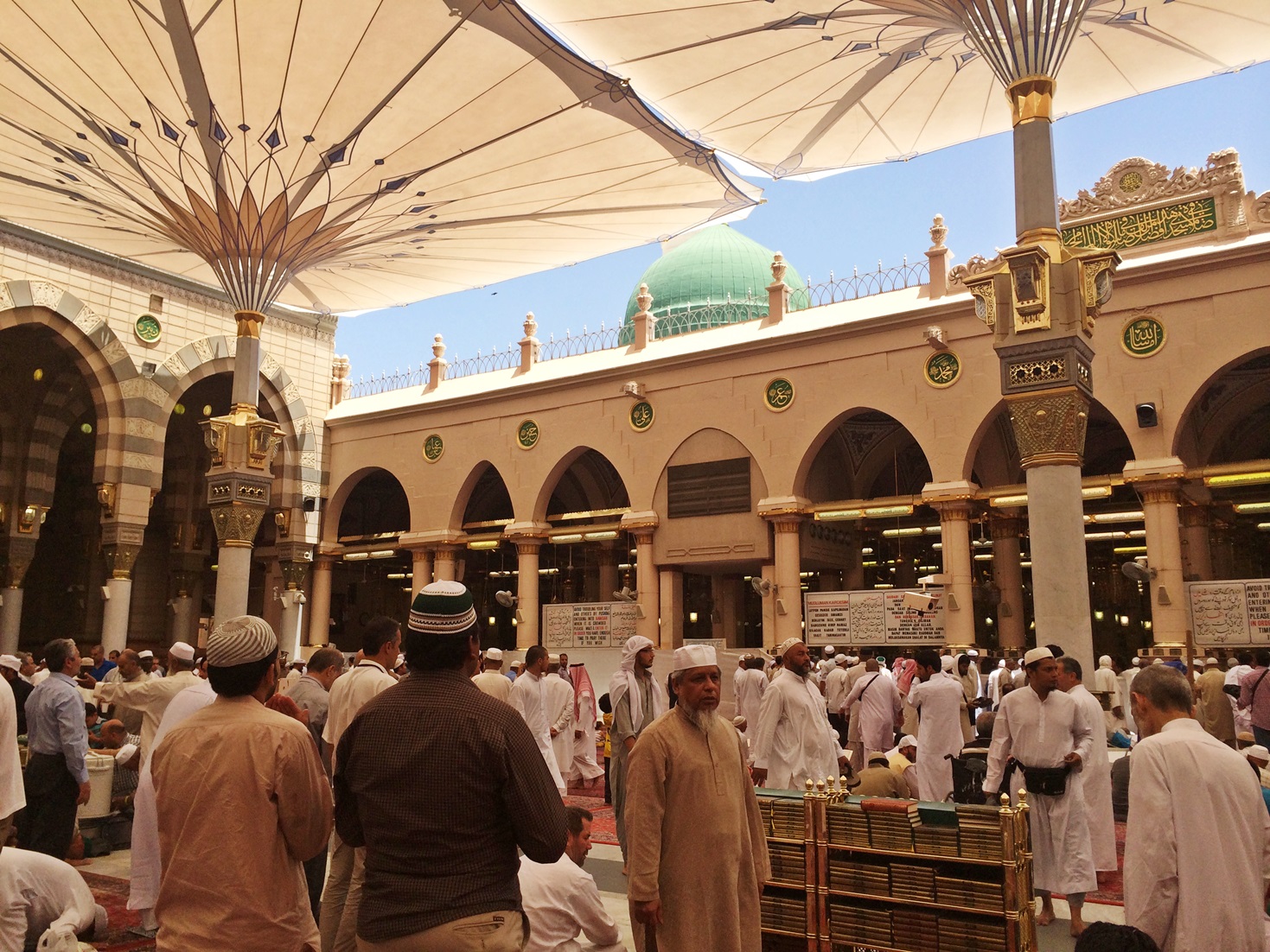 ผ่านบริเวณเขตเราเฎาะฮ์ของท่านศาสดา ที่เห็นพี่น้องมุสลิมกำลังละหมาดกันอยู่ ส่วนผนังสีเขียวด้านขวานั้น คือบริเวณสุสานของท่าน