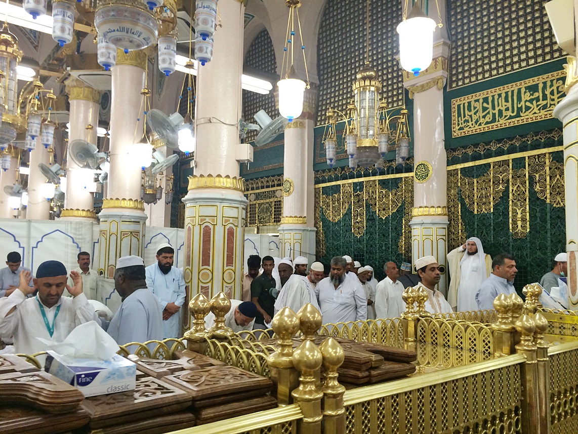 สังเกตุผ้ากั้นข้างหลัง เจ้าหน้าที่กำลังเตรียมกั้นผ้า การเข้าซียาเราะฮ์(เยี่ยมเยียน)ไว้สำหรับมุสลิมะฮ์(ผู้หญิง)โดยเฉพาะ เพื่อจะให้ผู้หญิงได้เข้ามาละหมาดในบริเวณเราเฎาะฮ์และกล่าวสลามแก่ท่านศาสดาอย่างเท่าเทียมกันเหมือนผู้ชาย