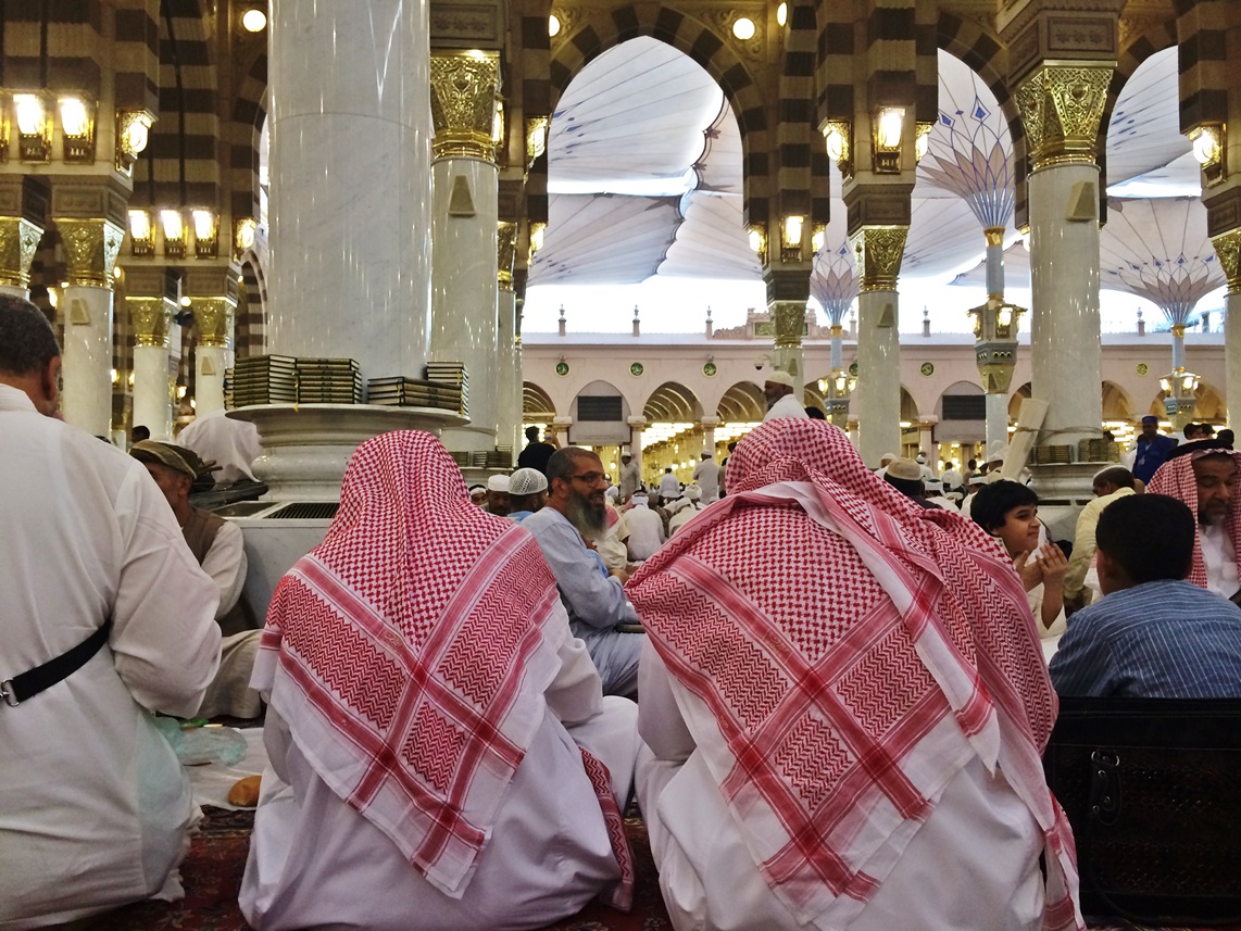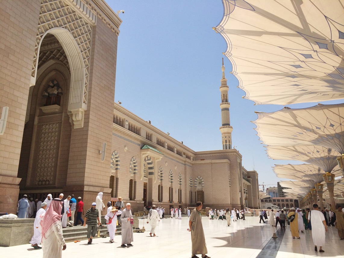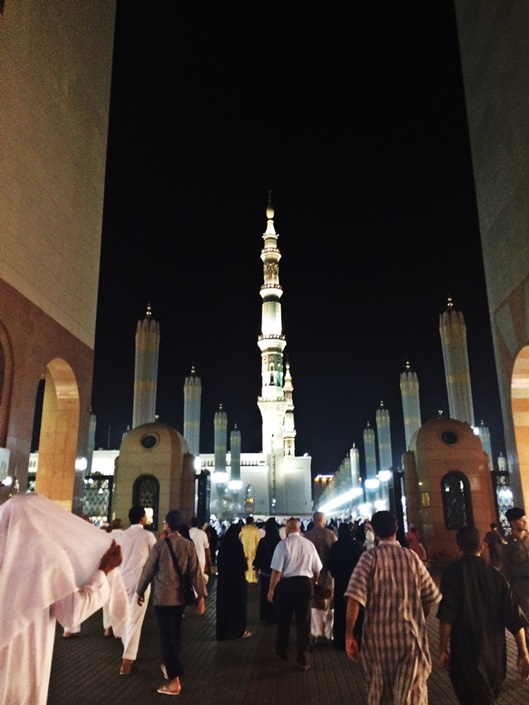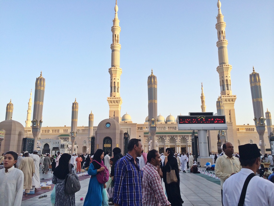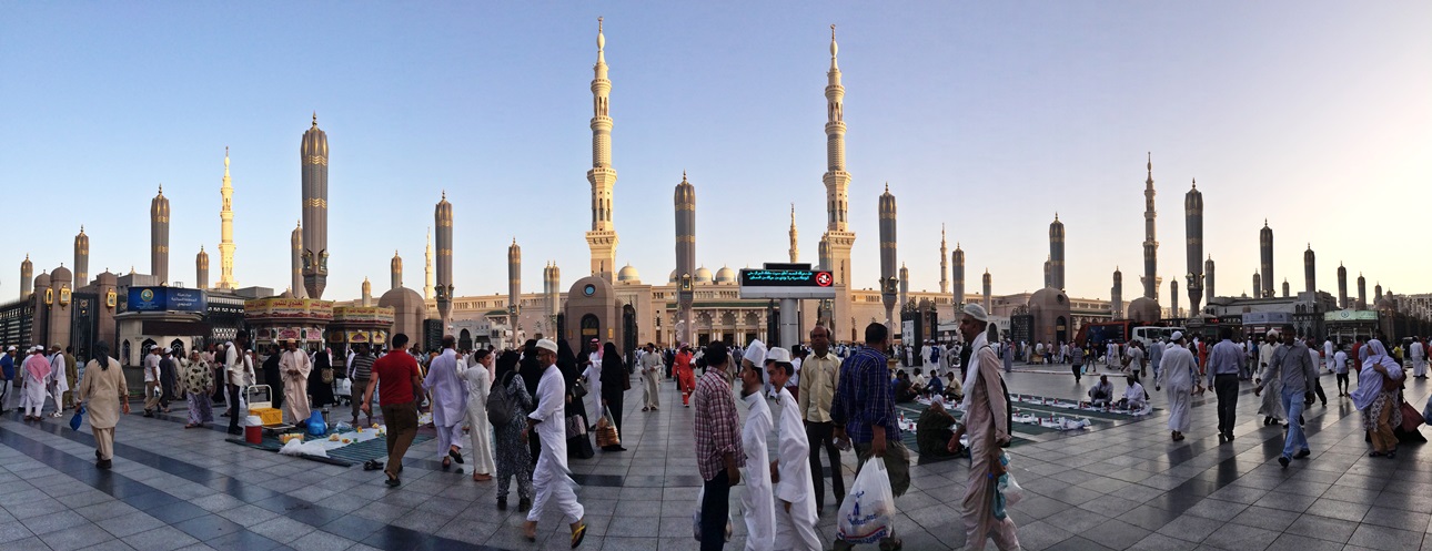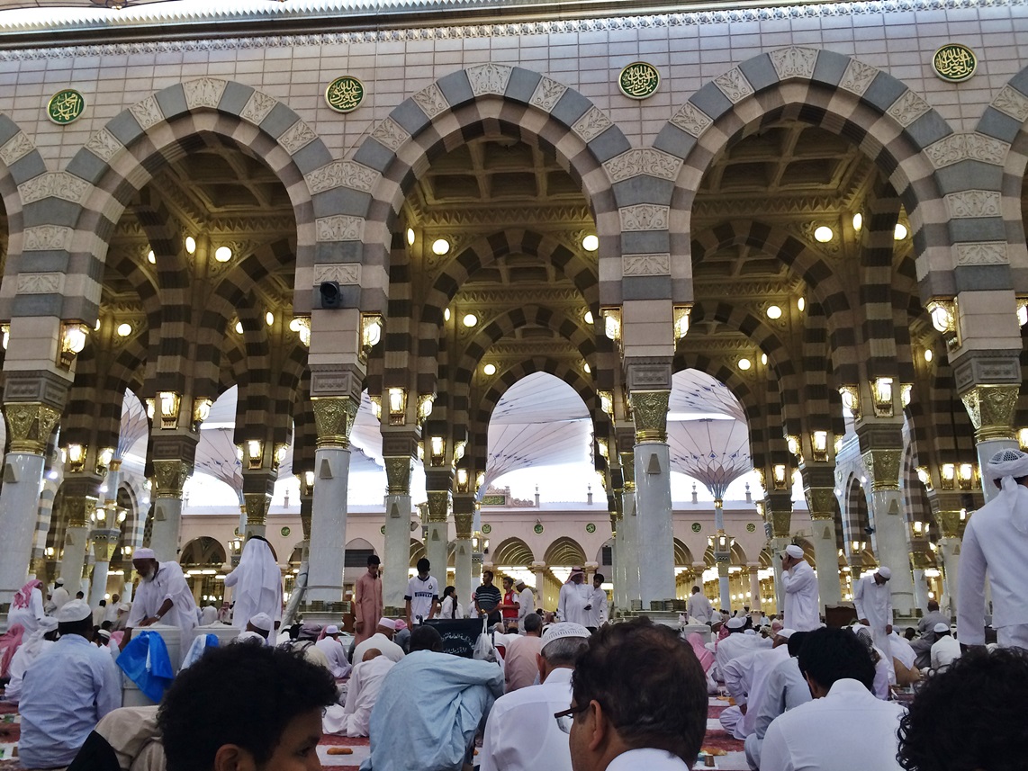 เดินออกจากที่พัก เห็นผู้แสวงบุญต่างทยอยกันมุ่งสู่มัสยิดกันเยอะแล้ว เดินผ่านร้านค้าต่างๆ ได้ยินเสียงเปิดอัลกุรอาน ตลอดเส้นทาง ข้างถนนจะเห็นมีจิตศรัทธายืนแจกอาหารละศีลอด แจกผลไม้ นมสด อินทผลัม ที่ขนมาเป็นเข่งๆ แก่ผู้แสวงบุญอยู่เป็นระยะ บางครอบครัวยกกันมาแจกทั้งบ้าน ได้ยินวัยรุ่นมาดีนะฮ์ตะโกนว่า”ซาบิ้ลๆ” มาจากคำเต็มๆว่า (سبيل الله) ซาบีลิลลาฮ์ หมายถึง ในหนทางของพระเจ้า หรือการทำสิ่งหนึ่งสิ่งใดเพื่อพระเจ้า รวมถึงการแจกอาหารละศีลอดด้วย ถ้าหากอยู่มาดีนะฮ์และมักกะฮ์ ถ้าได้ยินเสียงคำว่าซาบิ้ล รู้ได้เลยว่าบริเวณนั้นมีการแจกอาหารกันอยู่ ซึ่งถือเป็นกิจกรรมที่ดีมากๆ ที่นี่ไม่มีการแบ่งแยกระหว่างชนชั้น ไม่ว่าคนรวยหรือคนจน ก็ได้รับการปฎิบัติอย่างเท่าเทียมกัน