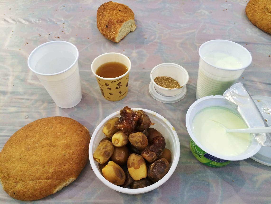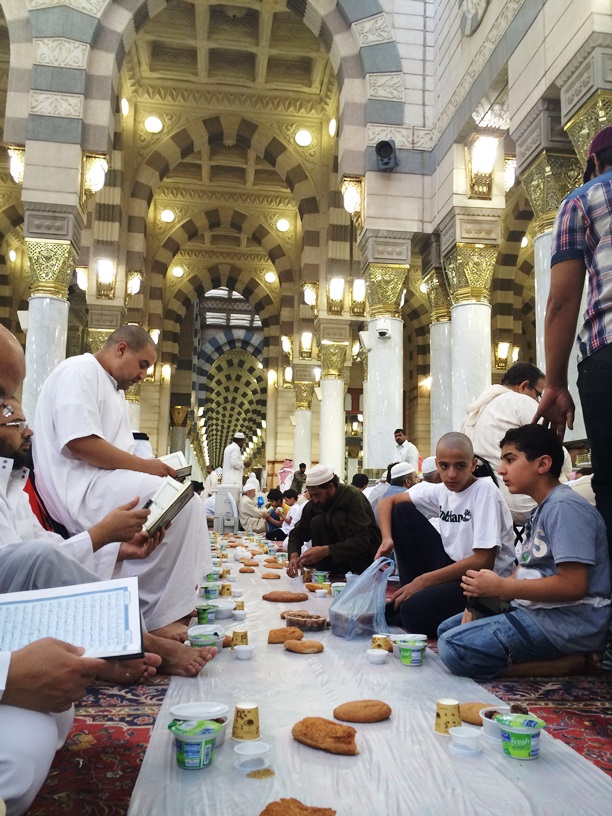 อาหารละศีลอด ที่เจ้าภาพจัดเลี้ยงวันนี้ มีอินทผลัมทั้งแห้งและสด ขนมปัง กาวาฮ์(กาแฟอาหรับ) น้ำซัมซัม โยเกิร์ต นมอูฐ และมีผงคล้ายสมุนไพร ทราบมาว่า เป็นยาระบายอย่างดีของชาวอาหรับที่ผสมกินกับโยเกิร์ต จริงๆแล้วชาวซาอุดี้ โดยเฉพาะชาวมาดีนะฮ์ พวกเค้ากินขนมปังเป็นอาหารหลัก มากกว่ากินข้าว ภายนอกมัสยิดที่จัดเลี้ยงพวกข้าวหมกแกะ ข้าวหมกแพะ หรือข้าวหมกอูฐ ส่วนใหญ่ที่เห็นเป็นคนจากชมพูทวีป(อินเดีย,ปากิสตาน,บังกลาเทศ) จะกินข้าวเป็นอาหารหลัก